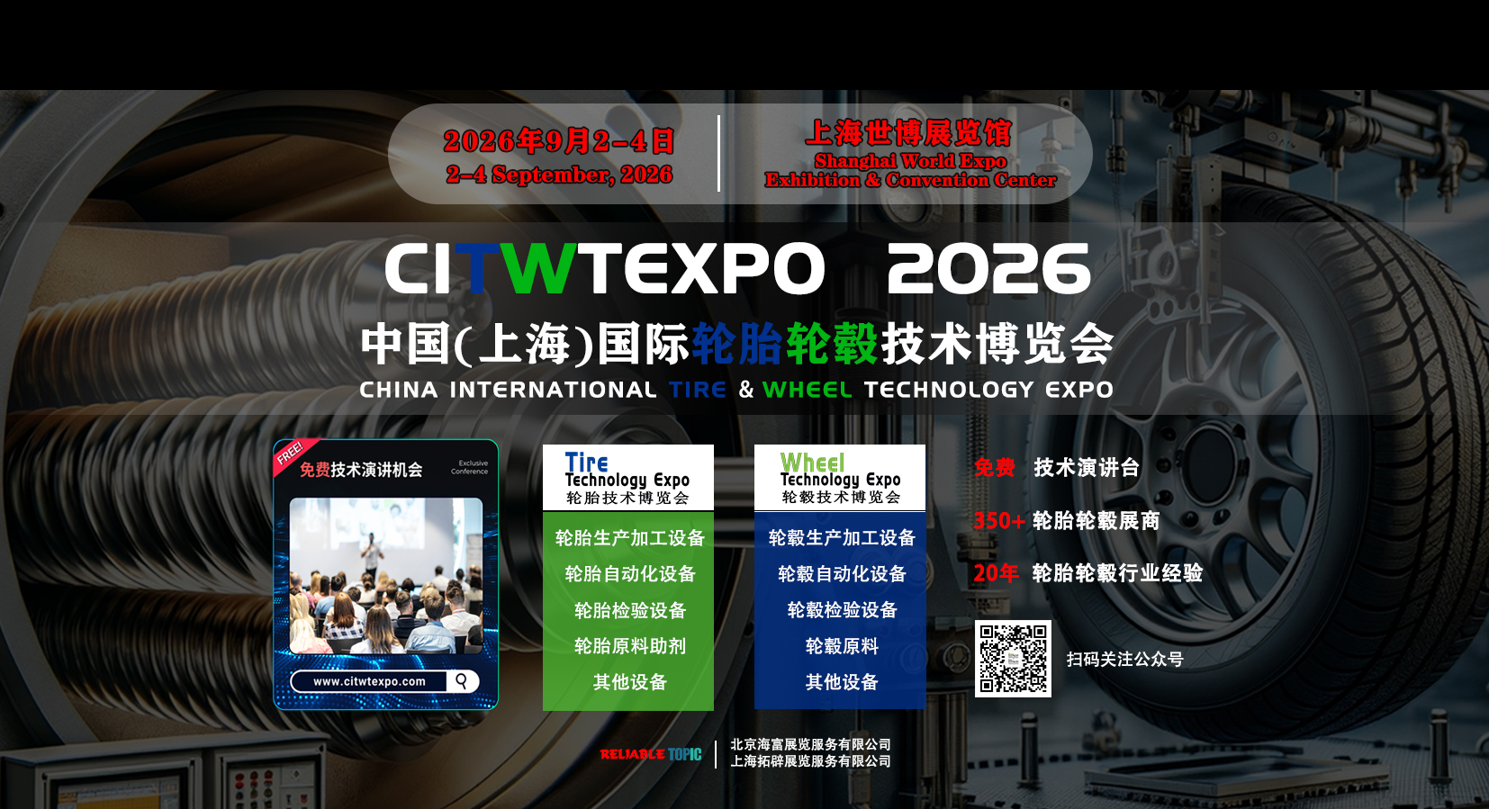 中國國際輪胎輪轂技術(shù)博覽會CITWTEXPO由海富展覽服務(wù)有限公司、上海拓辟展覽服務(wù)有限公司和著名的中國國際輪胎輪轂博覽會同期聯(lián)合舉辦。應(yīng)于廣大輪胎輪轂工廠客戶的需求,2026中國國際輪胎輪轂技術(shù)博覽會將于 2026年 9 月2-4 日在上海世博展覽館舉辦,旨在為全球?qū)I(yè)從事輪胎輪轂生產(chǎn)技術(shù)和設(shè)備的企業(yè),提供一個貿(mào)易治談及技術(shù)展演、交流的平臺。 查看更多